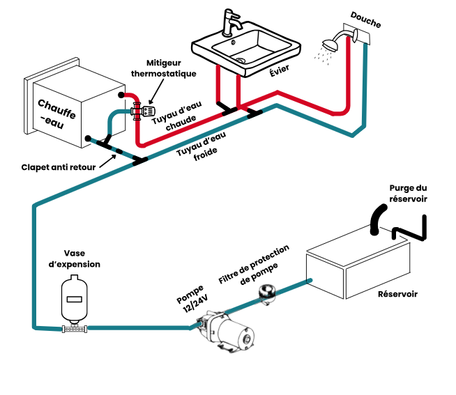 Réservoir d’eau : prévois au moins 30 à 50 L pour plus de confort.